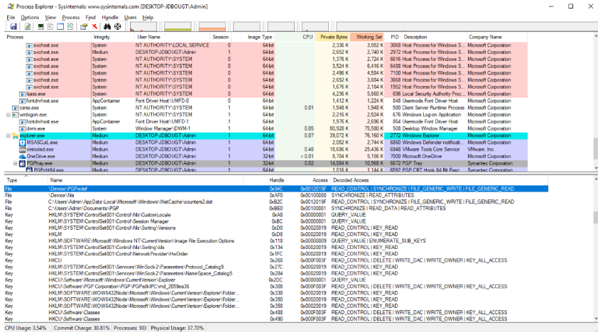 Before opening Windbg, we decided to perform a fast check over all running processes, in order to find out if at that point there was any process with an open handle to that device object. The results of that check were even more interesting. In fact, there was a process called PGPtray.exe that had an open handle to the aforementioned device object. That process was running with Medium Integrity Level [4], though.