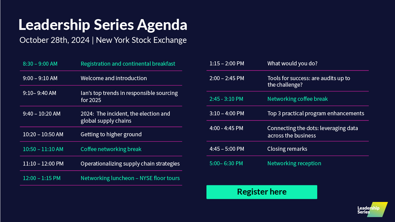 Join us at the iconic New York Stock Exchange on October 28, 2024, for a full day of insightful discussions, expert presentations, and engaging panel discussions at the New York Leadership Series 2024.This conference brings together industry leaders and innovators to delve into the latest trends and strategies in responsible sourcing and supply chain management.