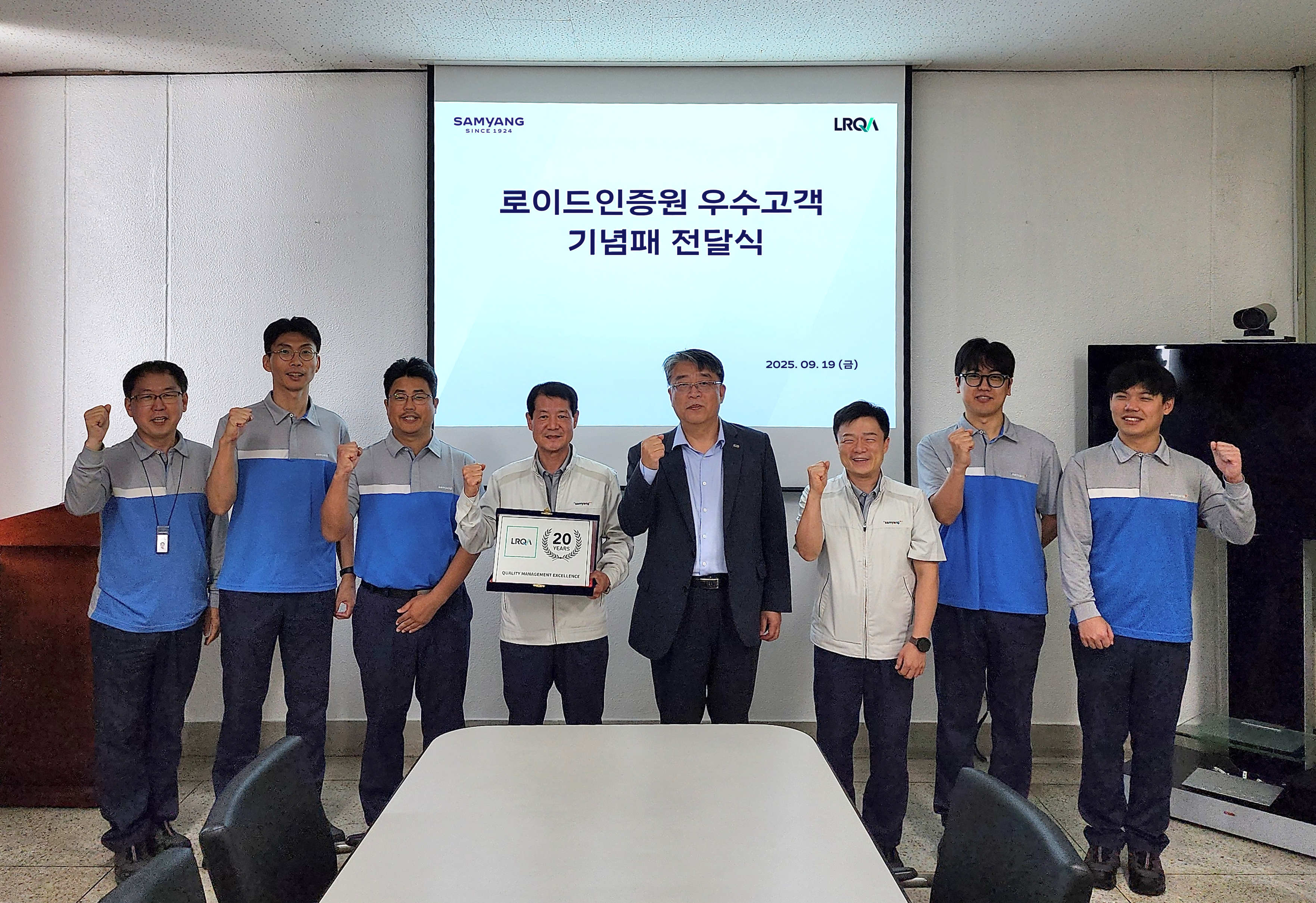 [사진: 삼양사 울산 1공장 제공: 전종혁 삼양사 울산 1공장장님(가운데), LRQA 김영훈 심사원님(가운데) ]